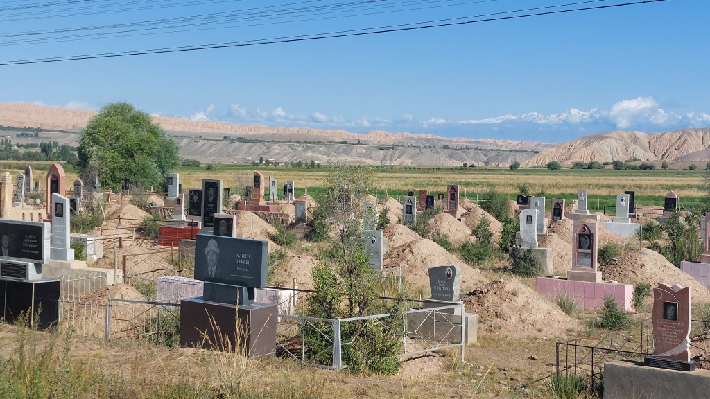 You may have spotted that the tops of some of the graves are decorated with both a crescent and a star. The crescent represents Islam (and 90% of the population is muslim), and the star represents the Soviet Union. Both symbols were used pre-1991, but some people continue to use both even today.