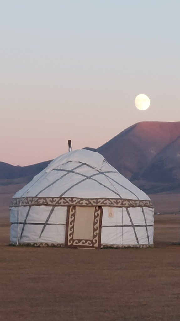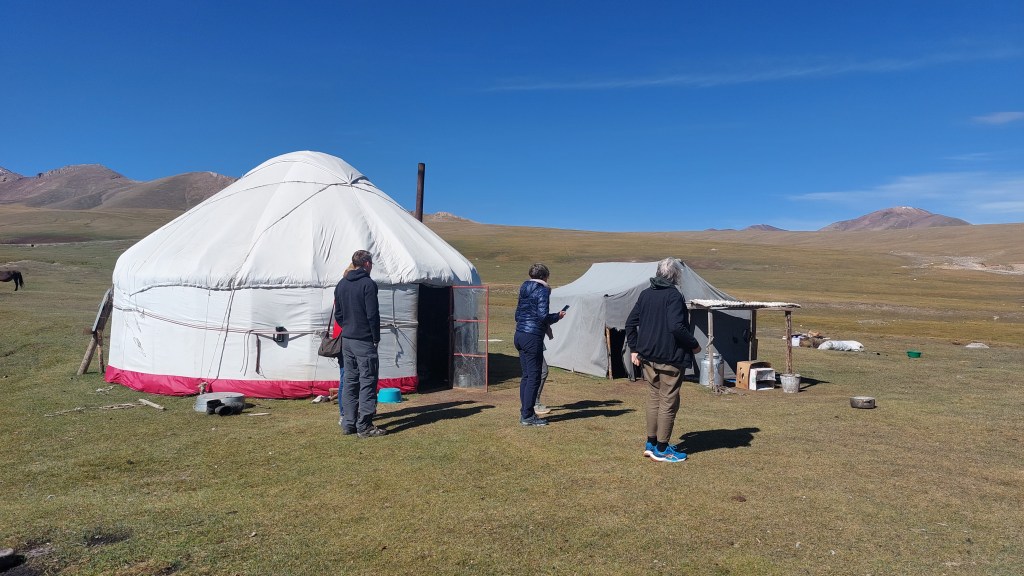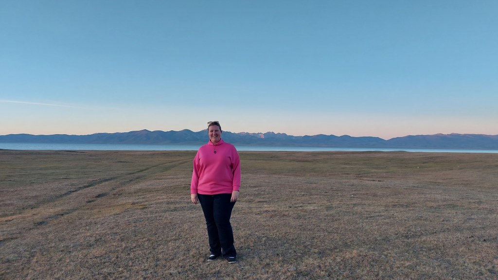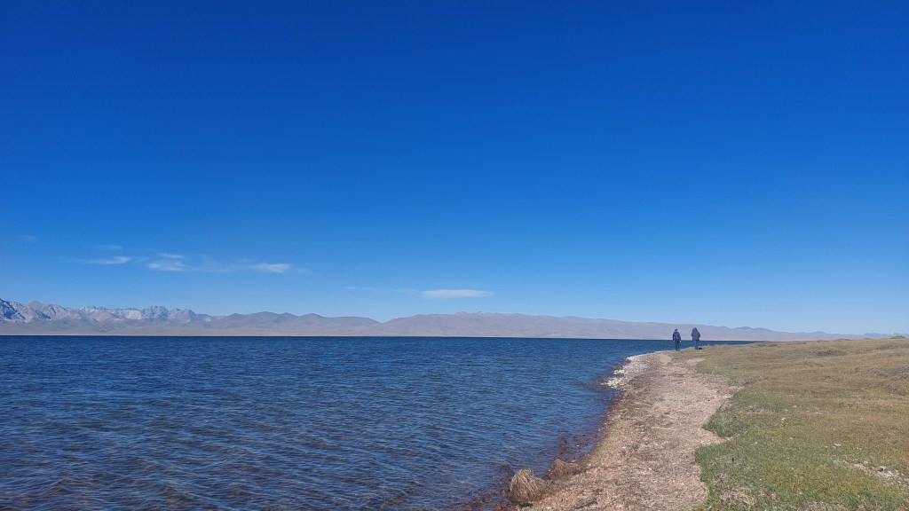 It took us longer than expected to reach Song Kul and we are now at an elevation of 3,000m (which I was certainly aware of on my 4am trip to the toilets when I was out of breath and with frost on the ground). Song kul means “end lake” as it literally is the lake at the end of the valley, and it was just beautiful: clear water with uninteruppeted miles of steepe, mountains, and sky.