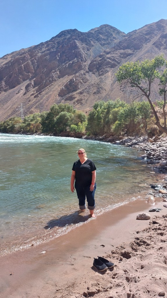 As we were driving through such beautiful scenery, we had been promised a picnic lunch. I had expected to be given a (perfectly nice) sandwich and maybe some fruit whilst sitting on the floor. However, Kyrgyzstani hospitality runs deep and our guide (Miko) and the aforementioned Anatoly produced folding chairs for everyone, a picnic table, a BBQ and mountains of food and proceeded to present us with a feast eaten on said chairs beside a beautiful river in the shade. Delightful.