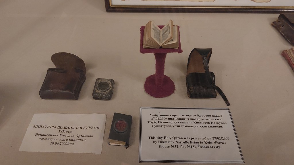 We then want on to the much restored Khazrati Iman Complex which is what is left of the old city and is a collection of buidings including a mosque, madrsah, library and museum. The museum contains one of the oldest qu’ran’s in the world dting back to the 7th century. Originally, a number of manuscrpts formed the Qu’ran, but these were consolidated into 1 book and these manuscripts were burnt. This 1 master book was copied into 6 and distributed across the known-world, but this is the only version to have (partially) survived. It was brought by Tamerlaine to Tashkent, then taken by the Russian’s to the Hermitage in St Petersberg before being given back in 1924. Unfotruantely I was not allowed to take photos, but what struck me most was the thickness of the paper (it eing written on deer hide) and the size of the script – I would guess around 10cm high. This was due to the fact that people were not all “good” readers and this was intended to ensure everyone could understand clearly what was written. Also in this museum is one of the smallest qu’ran’s in the world (written with a human hair), which I was allowed to photograph: