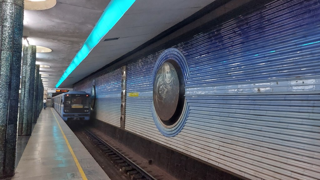 Next a little ride on the metro. Like many Russian designed metros, the stations are beautiful and the nearest station to our hotel is named “Kosmonavtiar” and is dedicated to various Soviet cosmonots (clue was in the name). Our Uzbek guide, Julia was most excited about Vladimir Dzhanibekov (who embarassingly I had never heard of!) who although not born in Tashkent, grew up here and is claimed as one of their own. He even has a physics thing named after him (the Dzhanibekov effect) which says: “rotation about an object’s intermidiate principal axis is unstable while in free fall”. Not 100% sure what that means, but is something about a nut spinning in zero gravity. Anyway, I was more interested by the painting of Valentina Tereshkova who was the first female cosmonaut in space in 1963 (as opposed to the Aericans who did not let a woman into space until 1983). Just saying.