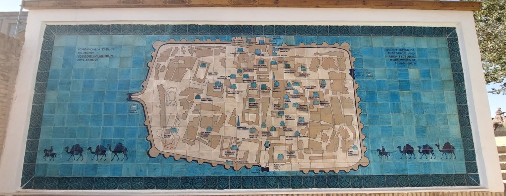 As you approach Khiva, the first thing you can see is the fortress wall surrounding the city. Khiva is not particularly large, so this includes the tourist locations, i.e., the palace, mosques, and madrassas, but also where most of the 3,000 population of Khiva live. The city you can see in the photos below is the 8th city it having been destroyed and rebuilt that many times, but the original dates back to the 5th century (that was then destroyed by Cyrus the Great and his Persian Merry Men). The walls are made of mud and straw, which gives them their distinctive pale brown colour (and apparently get refreshed every 4-5 year). At some point, the walls would have been surrounded by a 20-meter moat, and originally, the only gate would have been to the East. Today, there are four 4 gates, and our hotel (the first in Khiva apparently) was just inside the West Gate (bottom of the map).