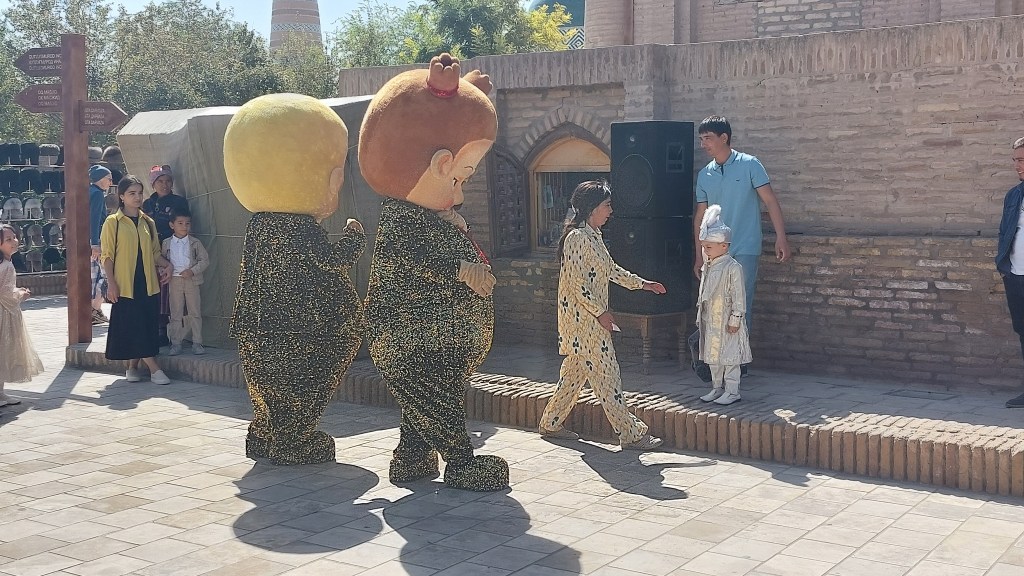 As we walked along the street, we were passed by two wierdly dressed characters (I suspect there is some IPR infringement going on somewhere) and a small boy dressed in a very fancy suit. This was apparently his “treat” for getting through his circumcision. He did not look very happy: