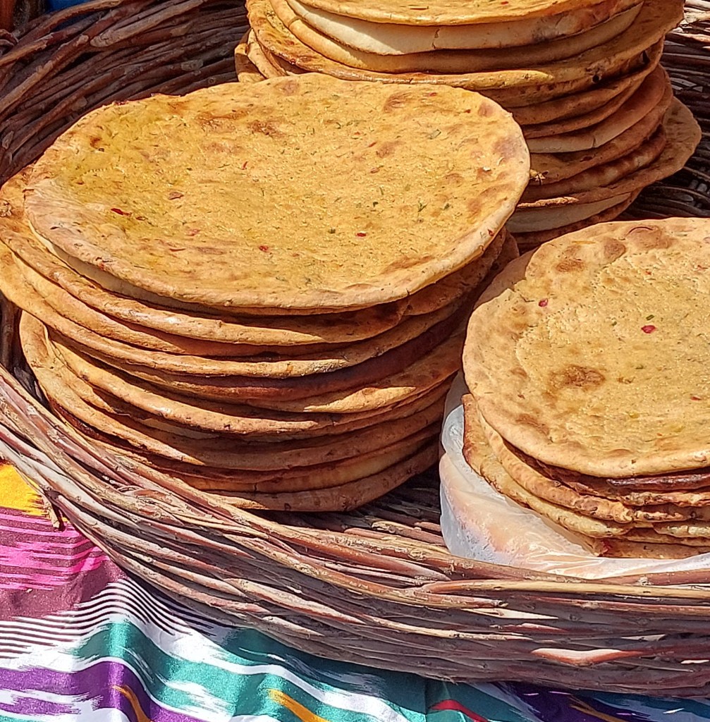 A quick stop for some Khivan bread (as we had been up since pre-4am) and coffees for the rest of the group before moving on. Khiva has its own very different style of naan than the rest of Uzbekistan. It is more like a flattened Indian naan, made of a white dough and cooked in a tandor, but comes filled with either vegetables (and chilli) or lamb.