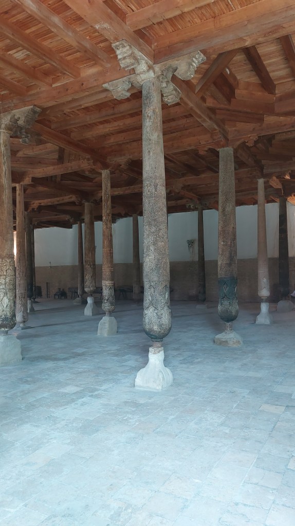 Finally, we visited the Juma Mosque, and don’t worry if you thought I was getting mosque-d out, as this was something different. This mosque dates back from the 10th century and avoided destruction by Gengis Khan and his merry men as they decided the 218 wooden columns would prove very useful stables! Over time many of the columns have been replaced, but generally the thicker columns are earlier and these are the only decoration as otherwise the building itself is very plain compared to the other mosques we have seen on this visit.