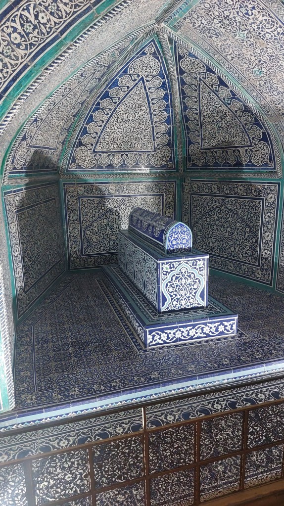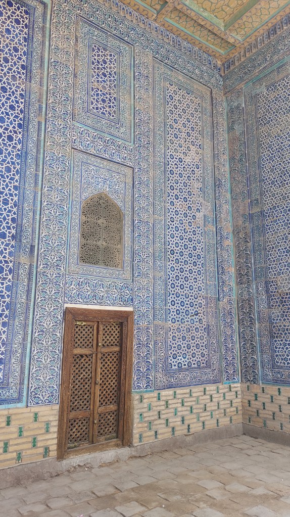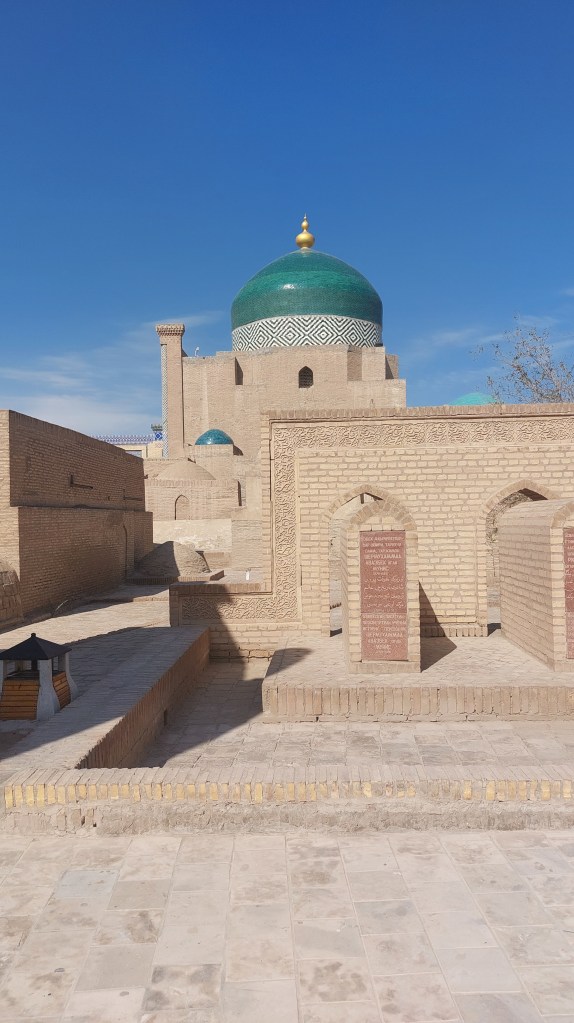 Early to bed so we were fully rested for our second (and final) day in Khiva. Our first stop was the Pahlavon Mahmud Mausoleum, which was a truly beautiful building. Pahlavon Mahmud was a poet, philospher, and wrestler who is something of a patron saint of Khiva following his death in 1326. He was a furrier by trade, and alongside teaching his students this trade, he also taught people philopsphy, Islamic law, and poetry. Only part of the structure dates back to the time of his death (as he wanted to be buried in his workshop), and the rest was added in the 18th century. This is also where a number of Khan’s of Khiva are buried. However, it is Pahlavon Mahmud who gets top billing. This is something we have seen across Uzbekistan where the fanciest/grandest mausoleums and gravestones are always those belonging to teachers rather than, say, royalty as you would have expected (little thought for you there Mum).