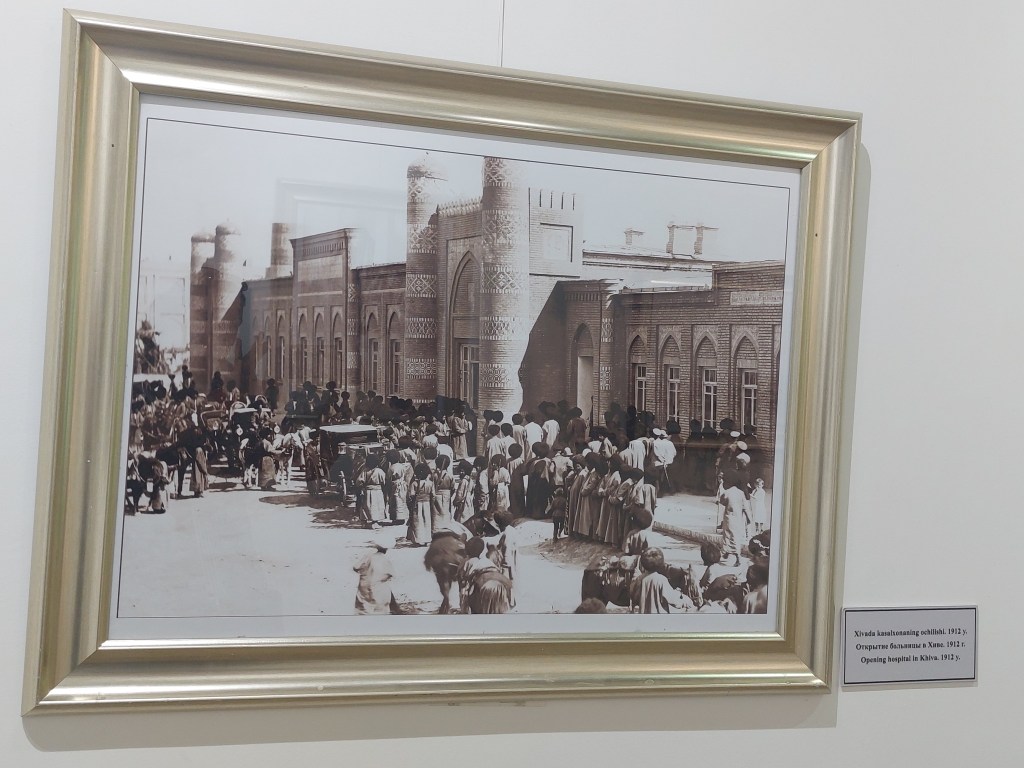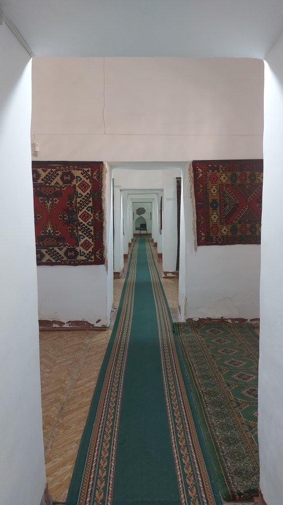 Next was the Islom Hoja complex, which includes Khiva’s tallest minaret at 52m tall (built in 1910) and a former Madrassa, which was converted into a hospital by the Soviets in the 1930s. It actually looks like quite a sensible reuse by adding a corridor between the rooms of the madrassa. This hospital was a huge benefit for the local population, which has been rather ignored as a feudal state by Tsarist Russia.