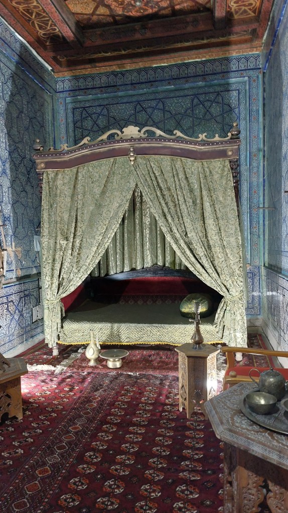 Our next stop was The Ark (which, as we have learnt, means fortress), which was effectively the palace and administrative centre for the Khan’s of Khiva who ruled until 1924. The Ark is much smaller than the Ark at Bukhara but more decorated. It is also further along in its restoration, which is why whole rooms have been recreated for the tourists to enjoy.