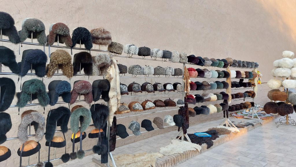 You may have noted the hats. These big furry hats are widely available across Khiva, and this is the only place we have seen them. During the days of the Khanate, they were compulsory, and a disgraced man would have to remove his hat. I have resisted the need to own one.