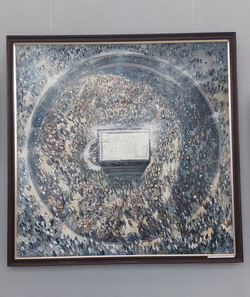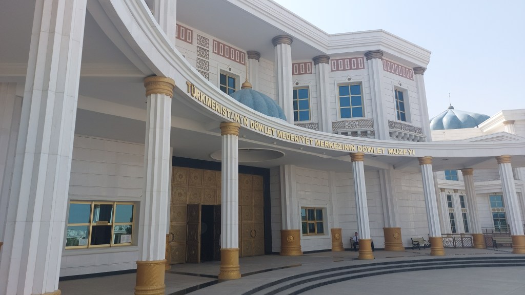 Our only real “stop” this afternoon was the History Museum. This huge building (modelled on Caser’s Palace in Las Vegas if you ask me) was opened in 1998 and contains multiple museums. We had a (very) speedy tour of the History museum (no photos allowed) with the first item on the agenda being the “independence” Hall which features a GIANT portrait of the current president Serdar Berdimuhamedow riding an Al-Teka horse, with his hunting dogs and mountains behind. This is very typical of much of the “art” we see in buildings and available for purchase. We then moved on to the actual history floor, which did give us a helpful overview – particularly of sites at Nisa and Merv, which we will be visiting later on this trip.