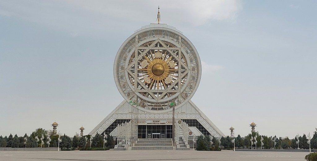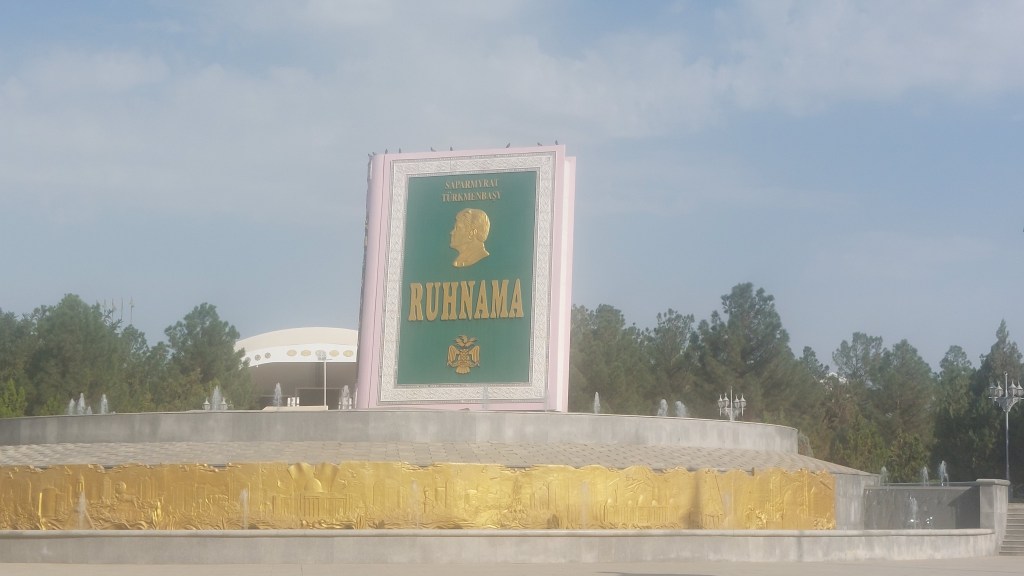 Then a short walk to a monument that really symbolises the cult of personality surrounding Turkembashy. It is a huge edifice of his book Ruhnama, which used to open and inside was a large screen that would project state approved media. Thankfully, this does not happen anymore…