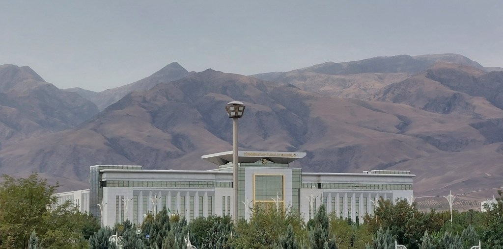 Almost everything you can see was built after the 1948 earthquake, which destroyed the city completely. There are some parts which date back to the Soviet reconstruction, but certainly where we were staying and much of the city that we saw, is the ultimate design of the first president of Turkmenistan, Saparmurat Niyazov who evidently loved white and gold (in the city cars are white, gold and very occasionally silver) and HUGE buildings. I have written more about Saparmurat Niyazov or Turkembashy (always referred to by either his full name or nickname) on my Turkmenistan page (here: https://travelswithkathryn.blog/country-page-turkmenistan/), and he did a wonderful job, apparently.
