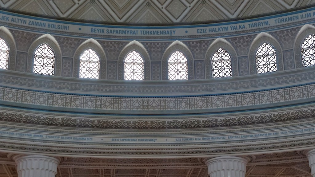 Our next stop was, according to Turkmenistan, the largest mosque in Central Asia, and next to it is the masoleum complex of Turkembashy. Those Islam experts amongst you, will be saying that it cannot be a mosque as it has latin (Turkmen) script on it – quotes from the Rumnana (more on this below) are printed around the inside of the dome. From the outside, the mosque certainly looks the part with 91m tall minarets (year of independence) and 48 windows around the dome (to commemorate the 1948 earthquake). Photos were discouraged here outside, as they do not want tourists taking photos of anything being reconstructed, and work is currently taking place, but hopefully gives you a sense of the scale: