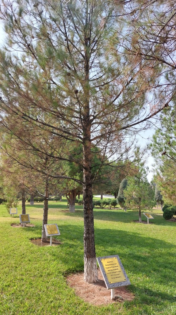 Our final real site of the day was the Independence Monument. This is (again) 91m tall, i.e. the year of independence, and there is a small collection of trees planted nearby, which are gifts from various nations commemorating Turkmenistan’s independence – I note that Austria’s is looking a little bedraggled… The design of the monument is that of a traditional Turkmen ladies hat and surrounding it are men from Turkmenistan history and tradition.