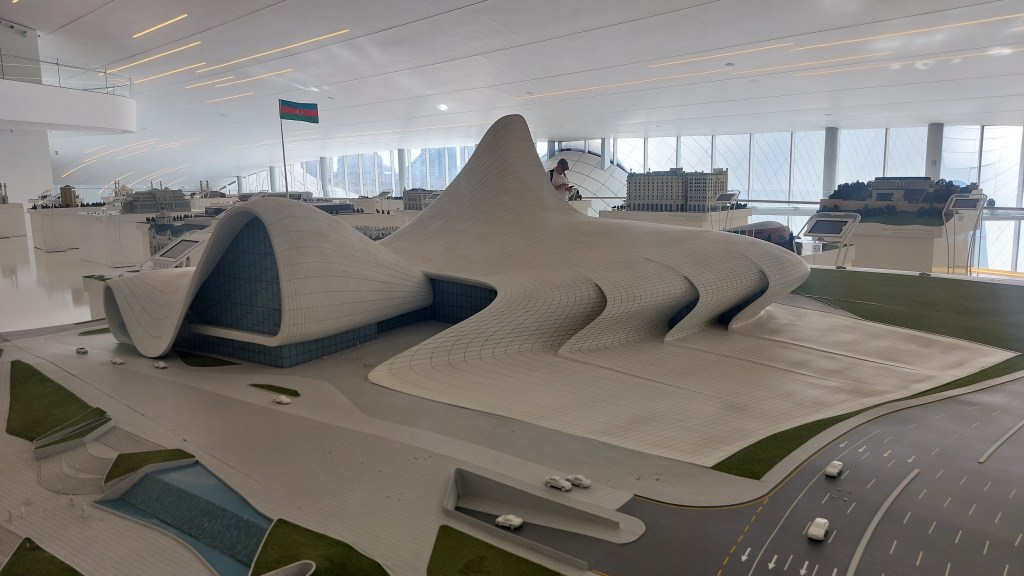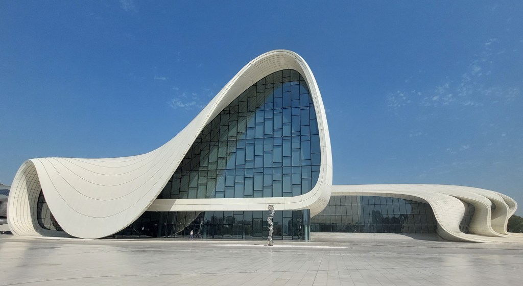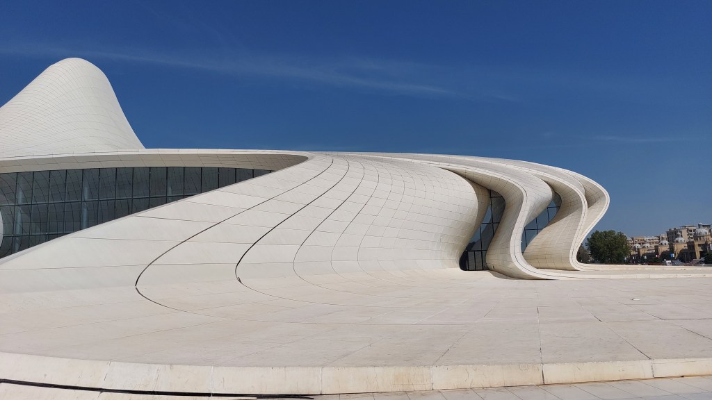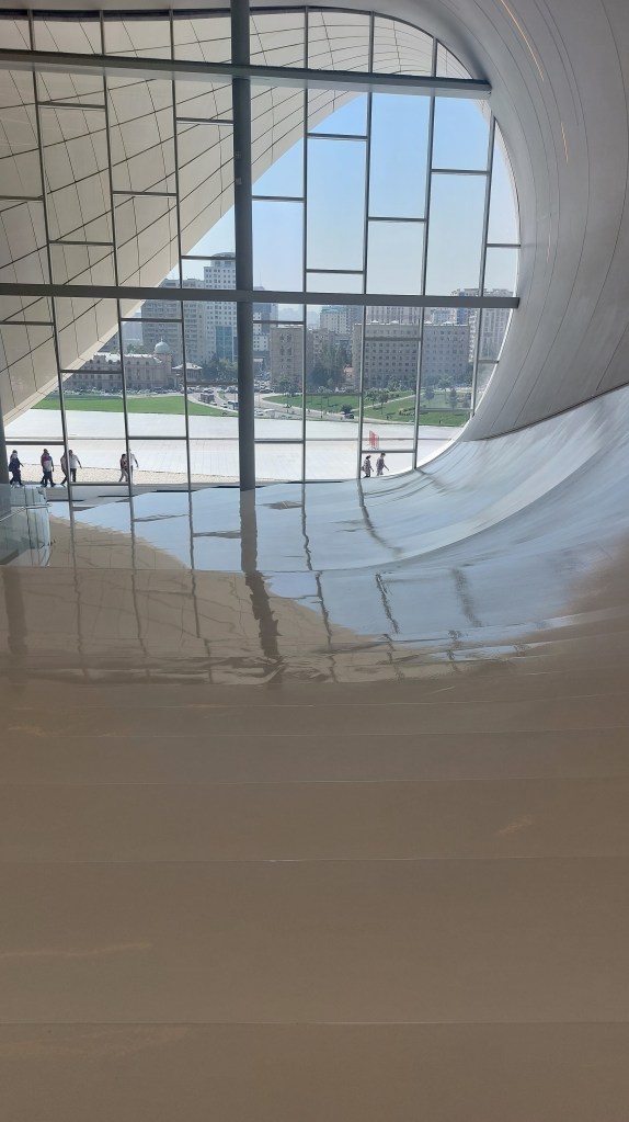 Today, I went to the Heydir Aliyev Center (and I cheated and took a Bolt there!). It was designed by Zaha Hadid and was opened in 2012. There is not a single straight line anywhere in the building, and its shape is intended to resemble a wave-like ascension from the ground to the sky, followed by a gradual descent back to the Earth. I know nothing about architecture, but even I can see that it is absolutely beautiful. Lots of photos to follow…