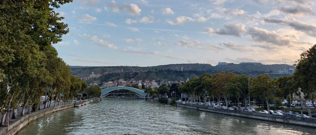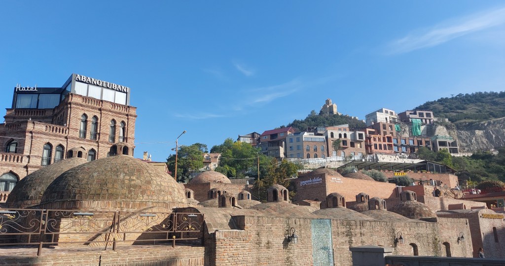 We then drove to Tblisi. Tbilisi has been the capital of Georgia since the 5th century when a sulphur spring was discovered, and the royal family decided to move the capital from Mtskheta to take advantage of it. Much of the city was built in the 18th/19th century and feels very European and cosmopolitan. Our hotel is central, but on the opposite side of the river to the Old Town, which means a VERY steep walk down to the nearest restaurant/crossing the river. We took it very steady in the dark on the uneven pavements with cars shooting past us. Sometimes it’s good to travel with old people…