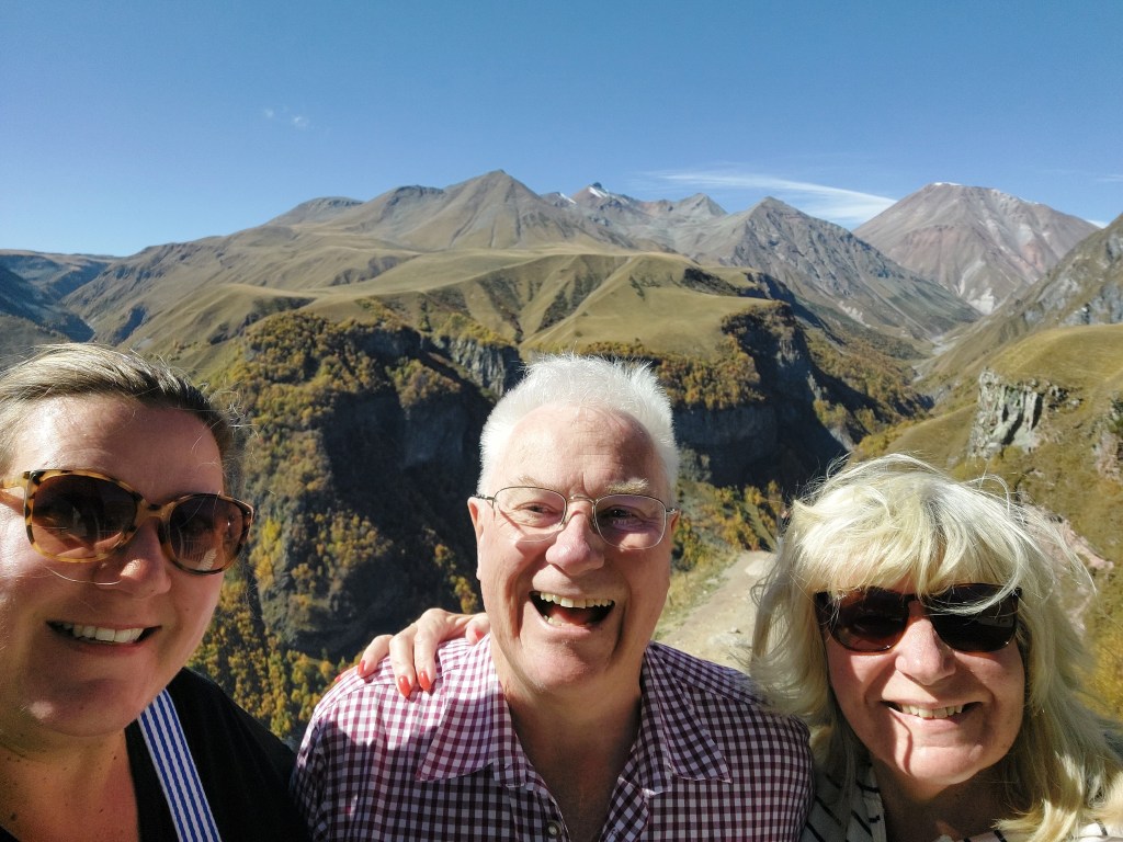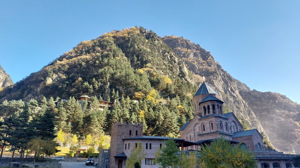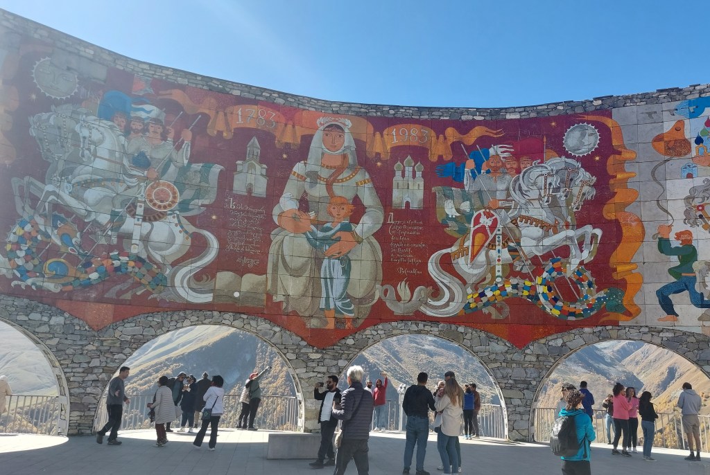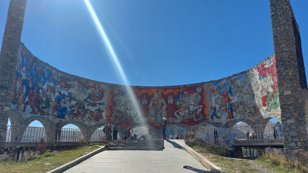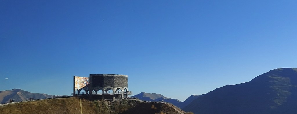 Further up into the mountains, we reached the ski resort of Gudauri. It is always a little odd to visit ski resorts out of season, and although there was a very tiny amount of snow on a distant mountain, the resort will not be open until December/January. However, what we were here was the interestingly named “Peace Balcony.” This was built in the 1980s as a symbol of peaceful friendship between the Soviet Republic of Georgia and the centre of the USSR, Russia. Our guide was quick to point out the irony here… The central image shows a lady and to her left are images of Russia – soldiers, folk figures, bread etc, to her right are images of Georgia – more of the same and also tractors (why one asks?).