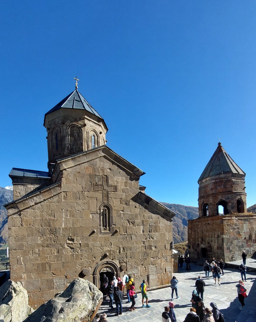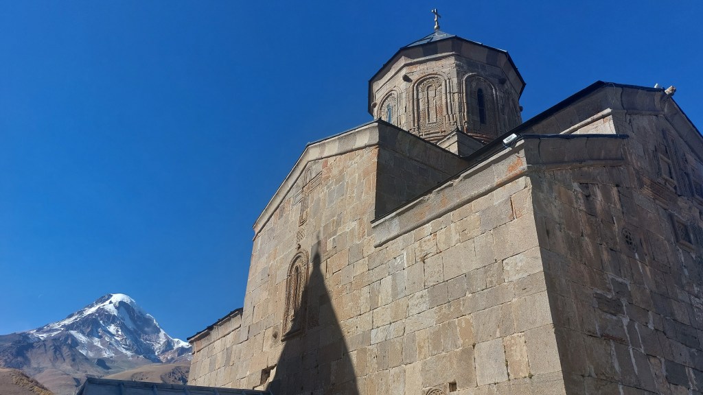 Now we were over the past, and we descended slightly to drive through the Gadari jorge to the Kazbegi Glacier. In the shadow of thsi galcier (and surrounding mountains) is the beautiful Church of the Holy Trinity. To reach this, we had to transfer into a 4×4 and then the final slog up the hill.