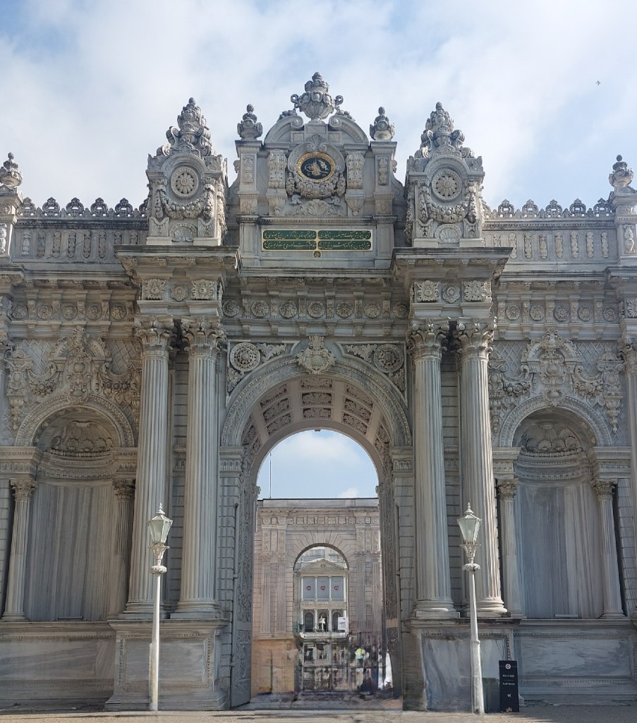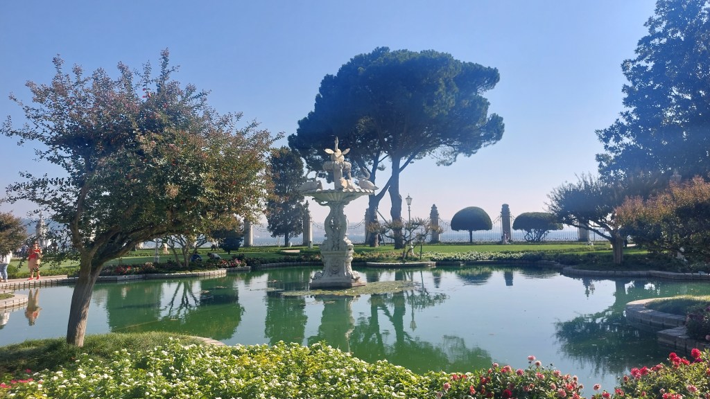 We had booked a skip-the-line tour, so we did manage to walk straight in and had a short introduction to the main palace and hareem. No photos are allowed inside any of these two buildings, but they appear very European in style although all rooms could have done with more furniture if you ask me – lots of chairs, but not enough side tables, cabinets etc and some of the art appears to be used as filler rather than any great works or even (imho) semi ok pictures! The only rooms which give a hint that this is not your standard European palace are the bathrooms, as these are obviously hamans and the sultan’s in particular is perhaps the faniciest gilt and marble haman I have ever seen! See:
