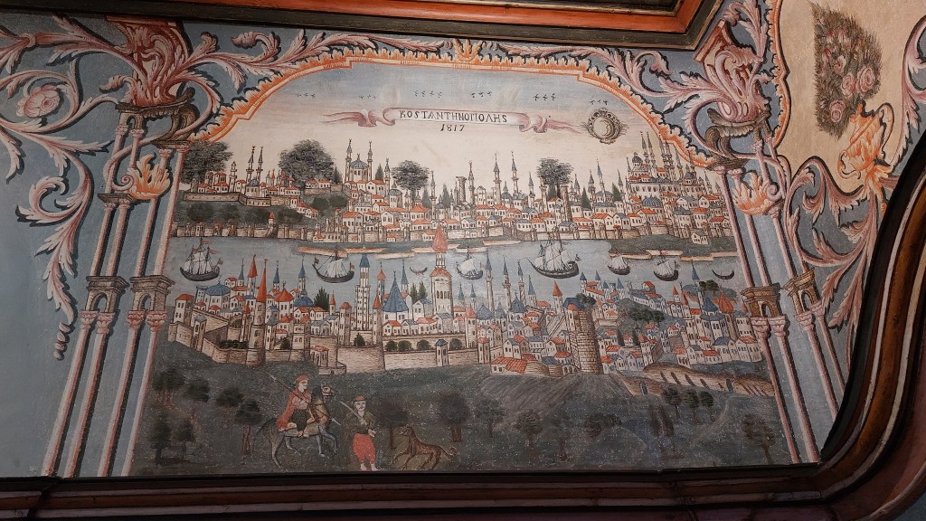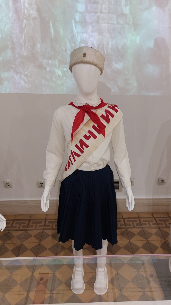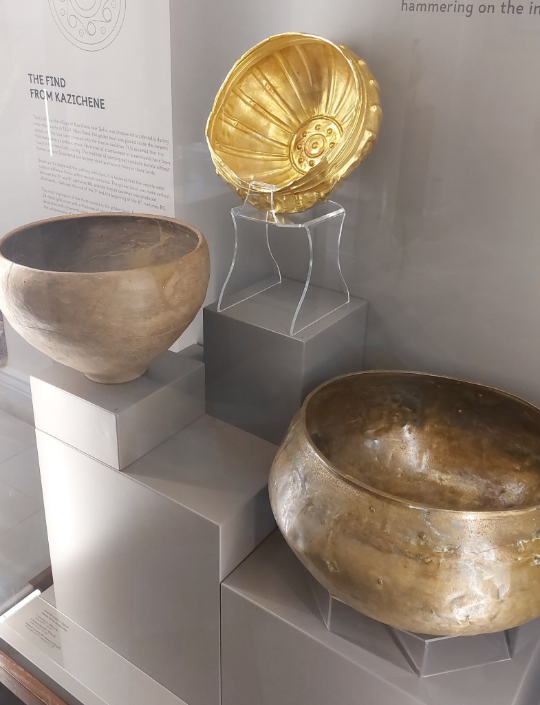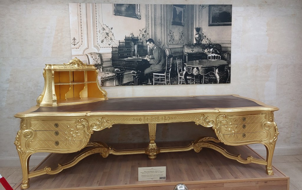 Next (with a pitstop for a drink of some more of that healing thermal water – a girl has got to try!) I visited the Sofia History Museum (housed in the former bath complex). This is an excellent museum (and very reasonably priced at about £3) and shows exhibits from Sofia dating from the Stone Age to a new exhibit entitled “A Communist Childhood.” I particularly enjoyed the hall dedicated to the Tsarist years. After independence, the Bulgarians felt they should have a royal family as everyone else in Europe did(!) and elected their first Tsar, Alexander of Battenburg and Hesse (who came heavily recommended by his uncle the Russian Tsar), he was not particularly popular and abdicated in 1886 to be replaced by Ferdinand of Saxe-Coburg and Gotha. As an aside here, Ferdinand technically is from the same house as the British Royal family until the death of Queen Elizabeth II as it was Prince Albert (husband of Queen Victoria’s) house) until it was renamed “Windsor” in 1917 to sound less German! For the royal history nerds, although Charles III has retained the name Windsor, technically (as it flows down the male line), he is the house of Glucksburg/Battenburg/Mountbatten (also renamed to sound less German) which makes him a relative of Tsar Alexander I – oh the complicated intermarriage of European Royals. Anyway, the Tsar’s were given some lovely gifts although I do think giving a man a desk as a wedding present is rather strange…