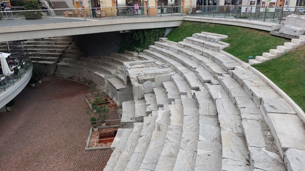 Much like Sofia, when doing some building in the 1960s, various remains of the Roman city were uncovered. Firstly, this 2nd century Roman Amphitheatre. You can still see on some of the good seats (those with a back rest) engraved gold letters of a family name thus reserving those seats – today it is used as a theatre (Diana Ross played last year) and I wonder if families are trying to reclaim their seats. I know I would!