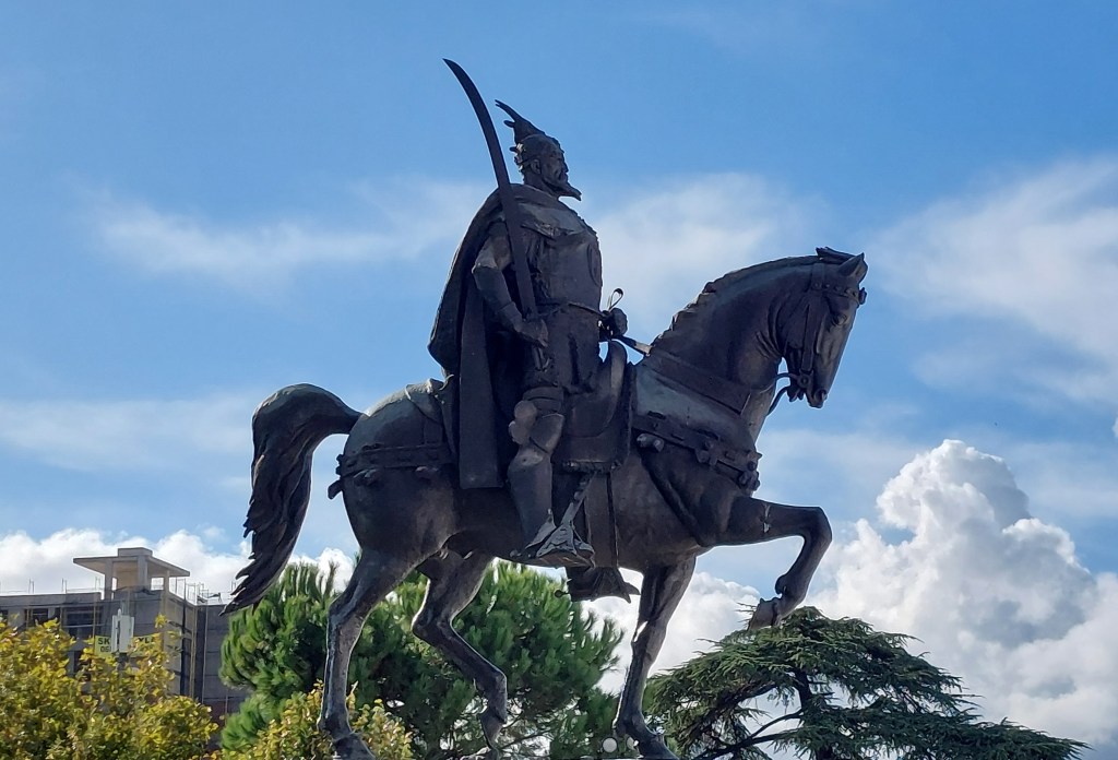 Skanderbeg Square (and the centre of Tirana surrounding it) was all built only 8 years ago. After the revolution with the opening up of Albania, there has been a huge program of building (often relying on foreign investment) and you can see in the background one of the 10 towers projects which is a project to build 10 unique skyscrapers in the city centre. Tirana is not a pretty city, but it avoided the Soviet building projects (Hoxha being more focused on totalitarian power and control), so it has a compact city centre, thus a walking tour is an excellent idea. Anyway, back to Skanderbeg Square, this is named for Skanderbeg who was a lord and military commander who led successful rebellion against the Ottoman Empire in the 15th century (his son was less successful, and later in the 15th century Albania fell back into Ottoman hands). As a child, he had been sent to the Ottoman court as a hostage and he was trained for the military and went on to serve in the Ottoman Empire for the next 20 years. However, in 1443, he deserted the army becoming ruler of an Albanian province and unified a number of other Albanian principalities. For the next 25 years, he fought the Ottomans many times and is considered one of the most successful opponents of the Ottoman Empire as he never lost a battle. His flag has become the flag of Albania – the double headed eagle being a symbol of the Byzantine Empire.