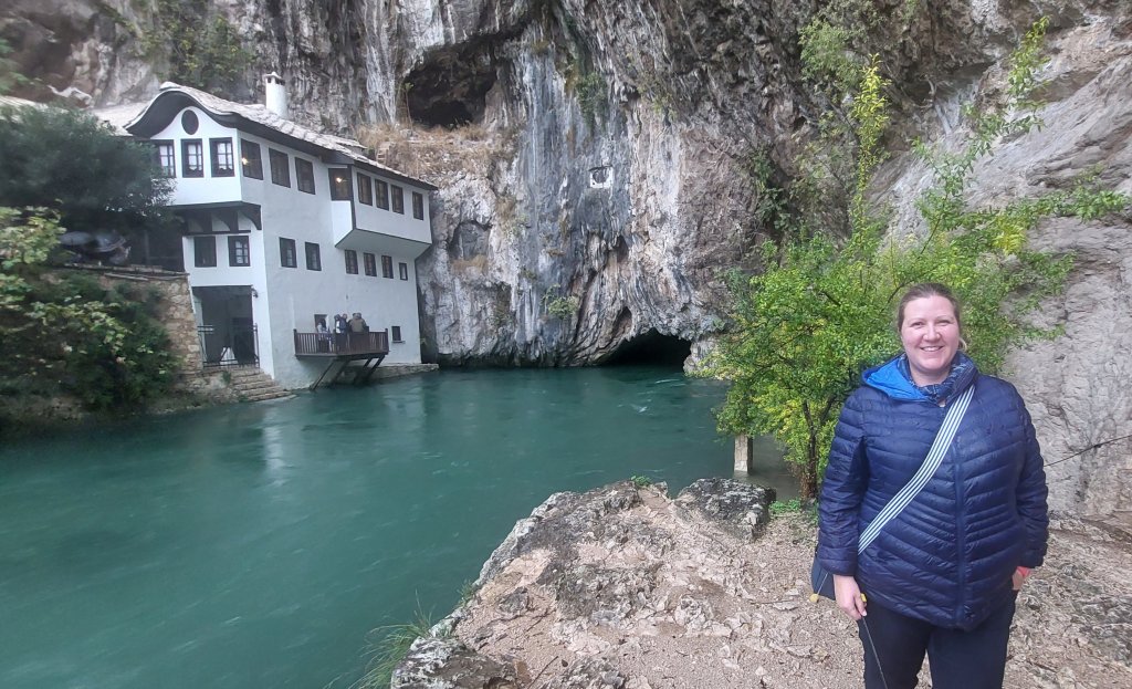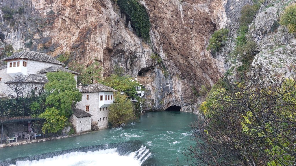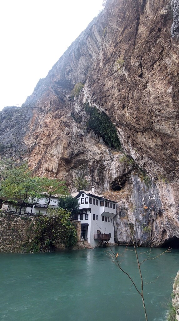 Next is the Buna spring. This is a natural spring inside a cave that pushes out so much water that it forms the Buna River. It may have been pouring with rain, but I am British and decided that this added to the watery beauty. On the other side of the river, the building you can see below is a Dervish Blagaj Tekke (temple). This community moved from Konya in the 15th century and established themselves here to be near the water source.
