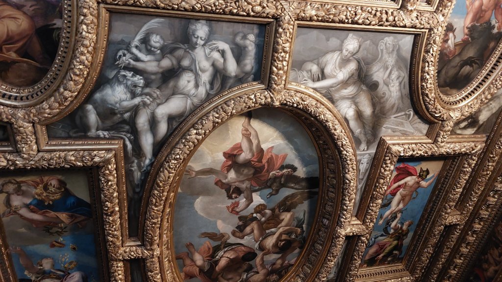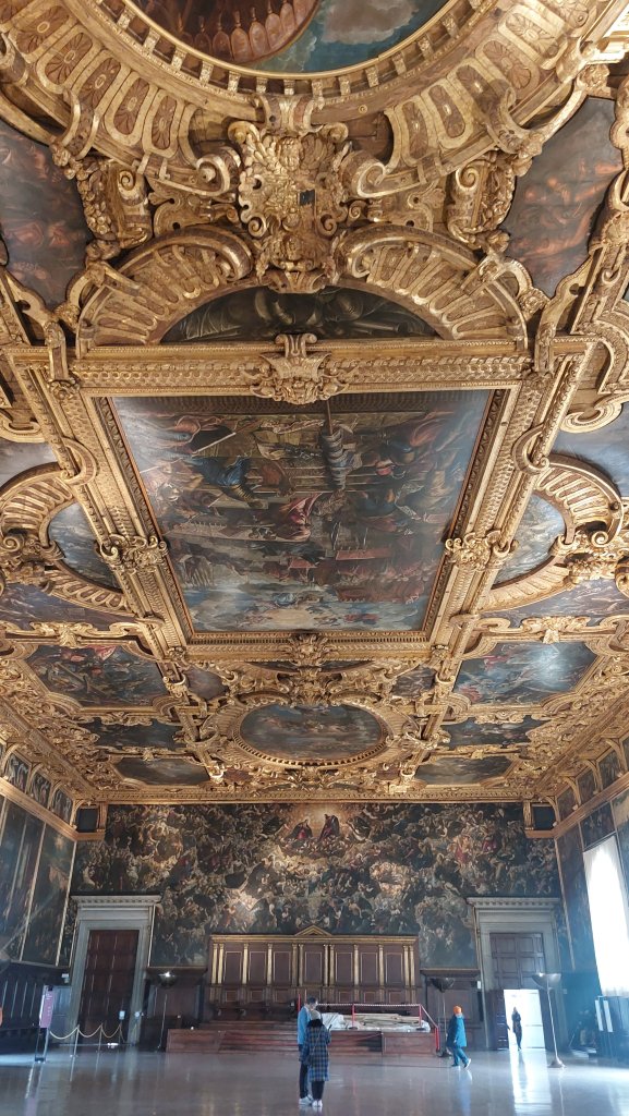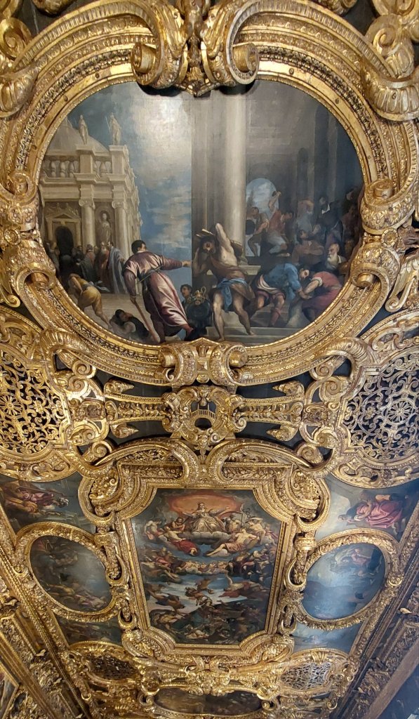 The Doge’s palace was built in 1340 and extended and modified in the following centuries. It contains both the Doge’s appartment as well as the administrative rooms. The administrative rooms (which have been restored) are awe-inspiring, and one can get quite overwhelmed by the sheer overdecorated nature of particularly the ceilings:
