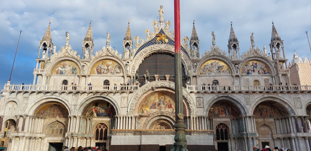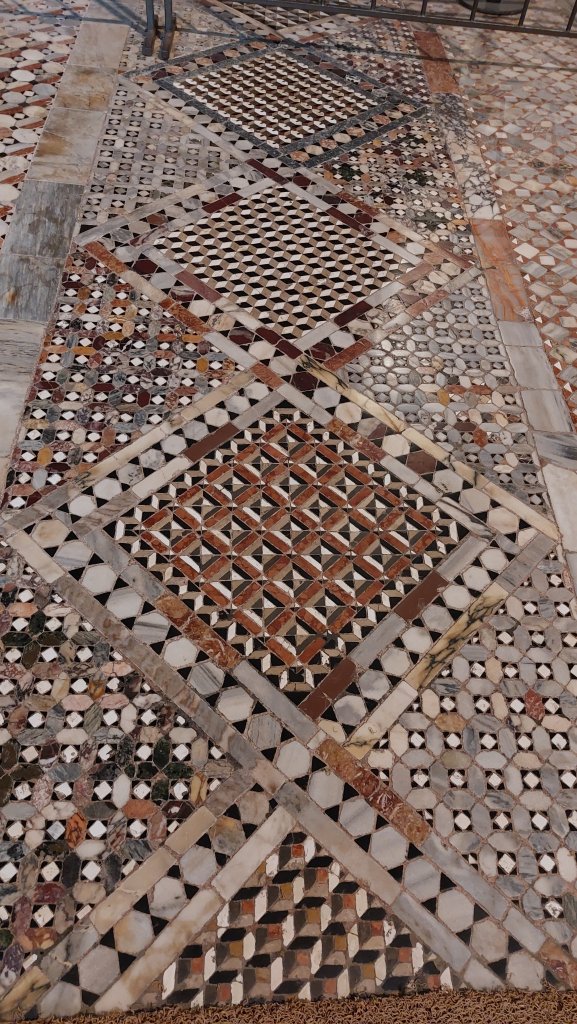 Continuing my excellent success in not waiting to enter key tourist sites, I also walked straight into St Mark’s Basilica. According to my guidebook, this 9th century “profusion of domes and over 8,000 square metres of luminous mosacis, Venice’s cathedral is unforgettable.” Now I have to be honest, having seen many (many) Byzantine churches on this trip I was a little meh about the interior (sorry). There are some very nice mosaics, but I have seen better, and they are not lit in a way to make the most of them. Maybe I needed to invest in a tour, and if we have time, I might try again tomorrow (and drag Maurane with me). What I was most impressed by was the floor (see below) made of marble from Syria, Egypt, and Palastine. The exterior is also fabulous: