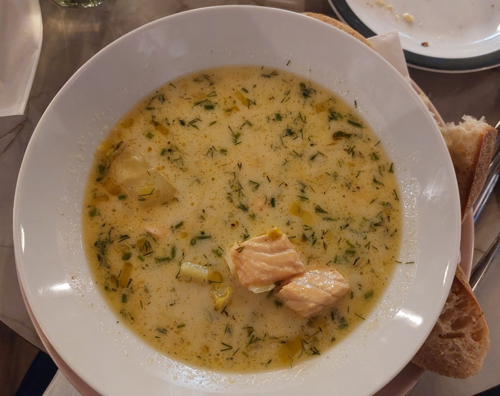 After the tour and to warm up, we visited the Central Market Hall, which contains a number of food options. This is obviously geared towards the tourist market (of which the vast majority are Japanese – huge Moomin fans apparently), but does make it an easy place to try Lohikeitto which is a creamy soup containing leeks, dills and big chunks of salmon. We also managed to buy the last Karjalanpiirakka, which is a small open pie filled with butter and eggs. You are probably getting the sense that Finnish food is not the lightest in calories, it is not, but it is both filling and delicious: