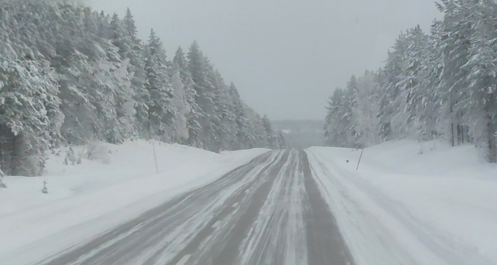 On Friday, we were all ready to set off for the 3 hour journey from Äkäslompolo south towards Rovaniemi. We had a little delayed start as the minibus that was coming to collect us, or more specifically, its trailer, lost a wheel on route and the driver had to stop to replace it – not something I would have enjoyed in -17 degrees! He also then did not want to risk the trailer’s wheel up the uncleared road/hill up to our hotel, so all the luggage and some of the people was loaded into the minibus, and I and others offered to walk down the hill where we met the minibus, were reunited with our luggage and off we went!