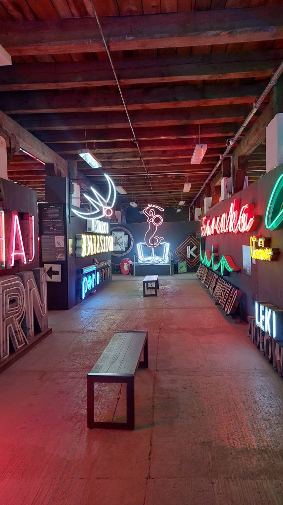 Today (Sunday), after a leisurely breakfast, we wrapped up (it being a forecast -8 today) warmly and took a tram over to the other side of the city to visit the Neon Museum. This started life as an enthusiasts attempt to “save” the Cold War era signs of Warsaw as they fell into disrepair, became too expensive to wswitch on (during the econmoic crisis of the 1980s) or as fashions changed post communism. I had not realised that at one point, Warsaw was considered one of the Neon cities of the USSR, not really associating communism with neon advertising. However, in the USSR, neon signs were not generally used as advertising (other than occasionally to advertise products that were not actually available such as butchers shops!) but more to make statements or mark locations. In fact, in the 1970s, Warsaw had its own commission that would check at night that all neon signs were working properly and fines were handed out for any faulty signage. Sounds a bit communist…
