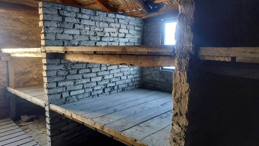 If an individual survived selection, they were housed in these barracks (mostly made of wood). Around 400 prisoners lived here with no running water or toilets, no floors (just mud), and 4-6 were assigned to each bunk with shared blankets. Today was indescribablely cold, and I was properly dressed. It is amazing that anyone survived – but of course, the plan was that they did not. After selection, the odds of survival were 2.2% for men and 3.5% for women.