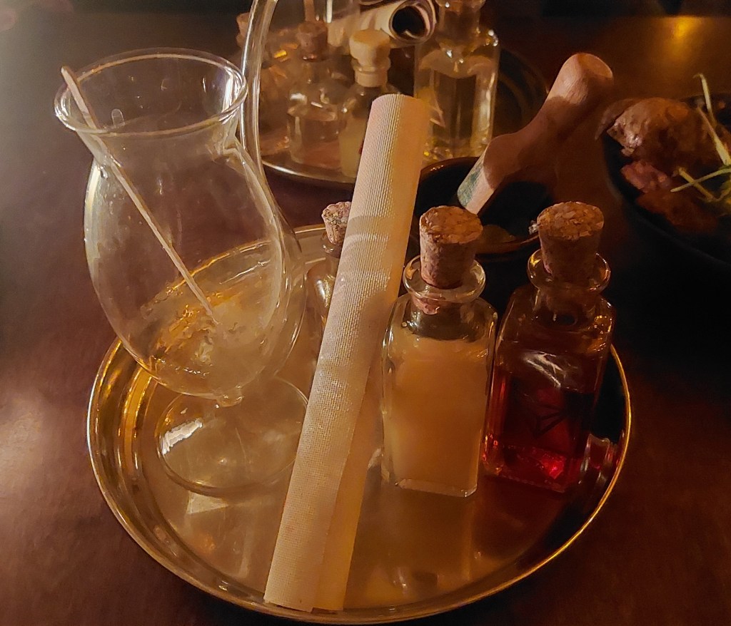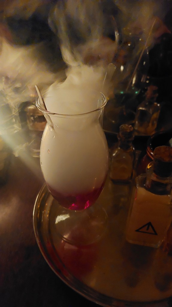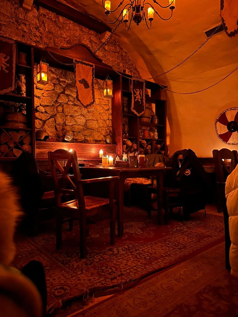 Now, I would have saved dinner for another post to give us all time to reflect, but I did not want to leave Krakow without regaling you with our dinner that evening in a Witcher themed underground hostelry called Tawerna Wilczy Dot. For those of you not familiar with The Witcher (such as Steph!), these are a world of fantasy novels by Polish author Andrzej Sapkowski, which gave birth to a video game and now a Netflix series. We started our evening with a mix-your-own potion (cocktail). As I am aware of my increasing age, I went for one promising youth, whereas Steph selected wisdom and then some added courage. For a themed restaurant, the food was also excellent!