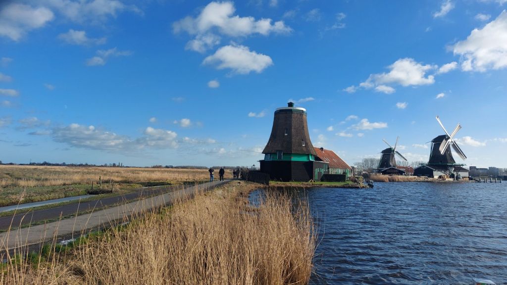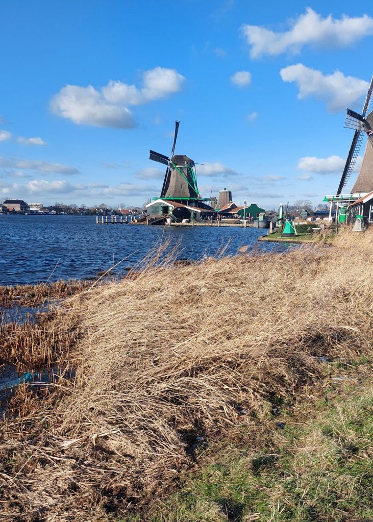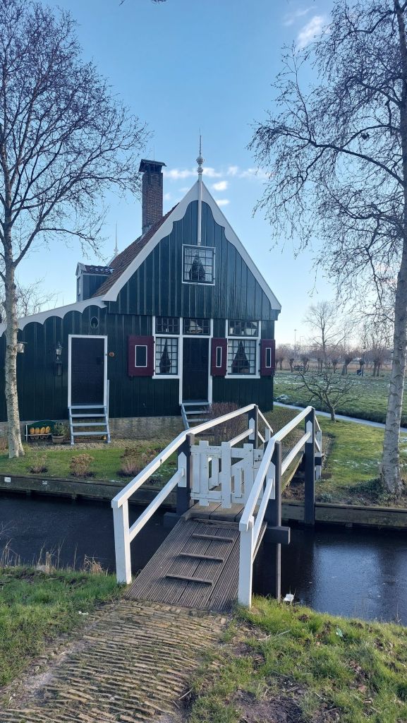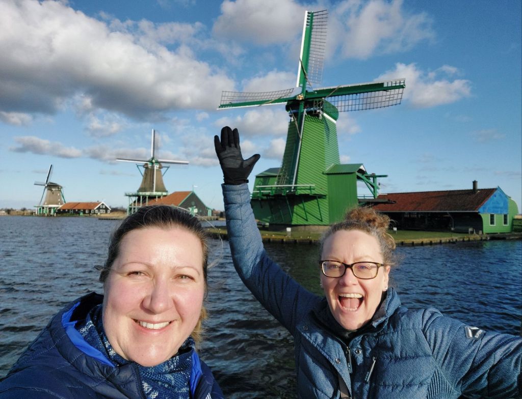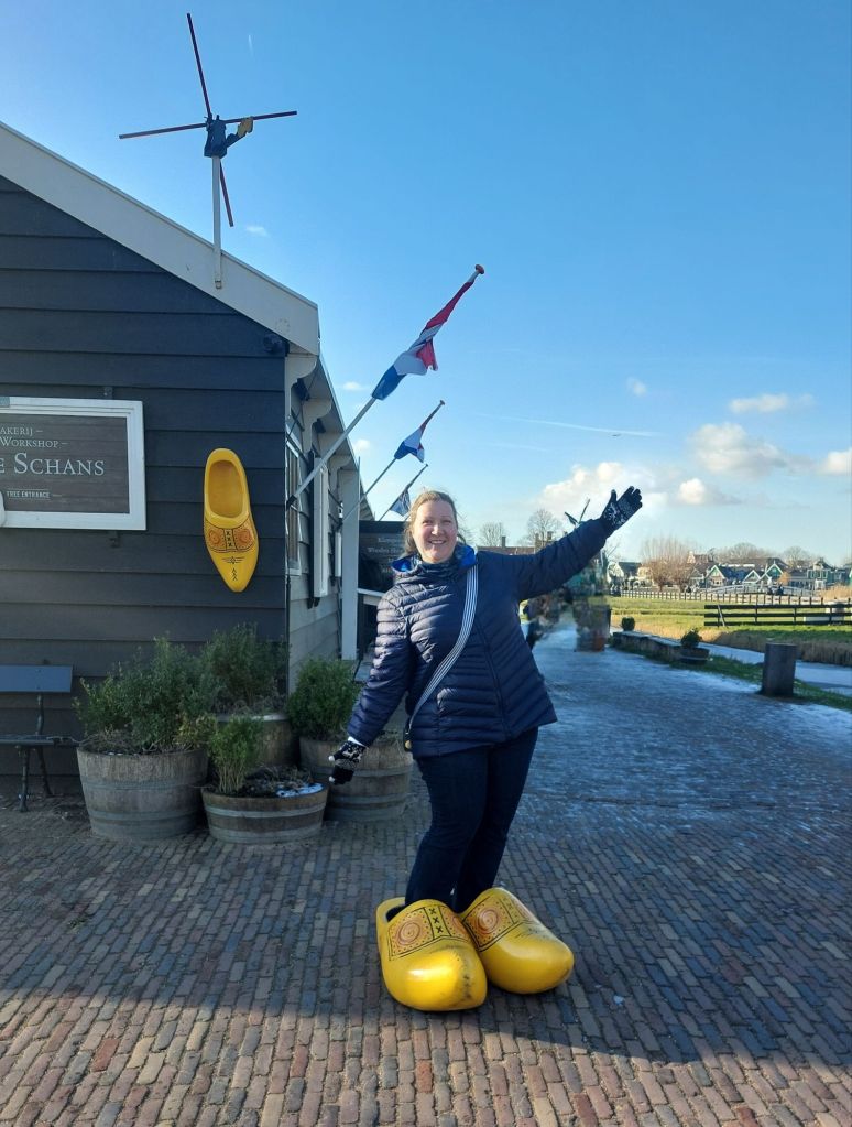 Friday was my last day in Amsterdam, and in many ways my last “real” day of this trip (as London does not really count) and I convinced Susan to take a trip to Zaanse Schans i.e. embrace the touristing. This is a small village about 30 minutes from the centre of Amsterdam. It is incredibly popular with tourists as Zaanse Schans has been preserved as it was when it was built in the mid-19th century at the start of the Dutch industrial revolution and has a mix of farms, paths, wooden houses, windmills, ditches and fields. We had expected to spend around 30 minutes looking around, being overwhelmed by tourists, and then back on the train with plenty of time for my train that afternoon. However, we were having a delightful time visiting the chocolate shop (with on-site milled cocoa), posing outside various windmills, playing with hceese wheels, and trying on clogs. There were many excellent shopping opportunities, most reasonably priced some of which I may have taken advantage of…