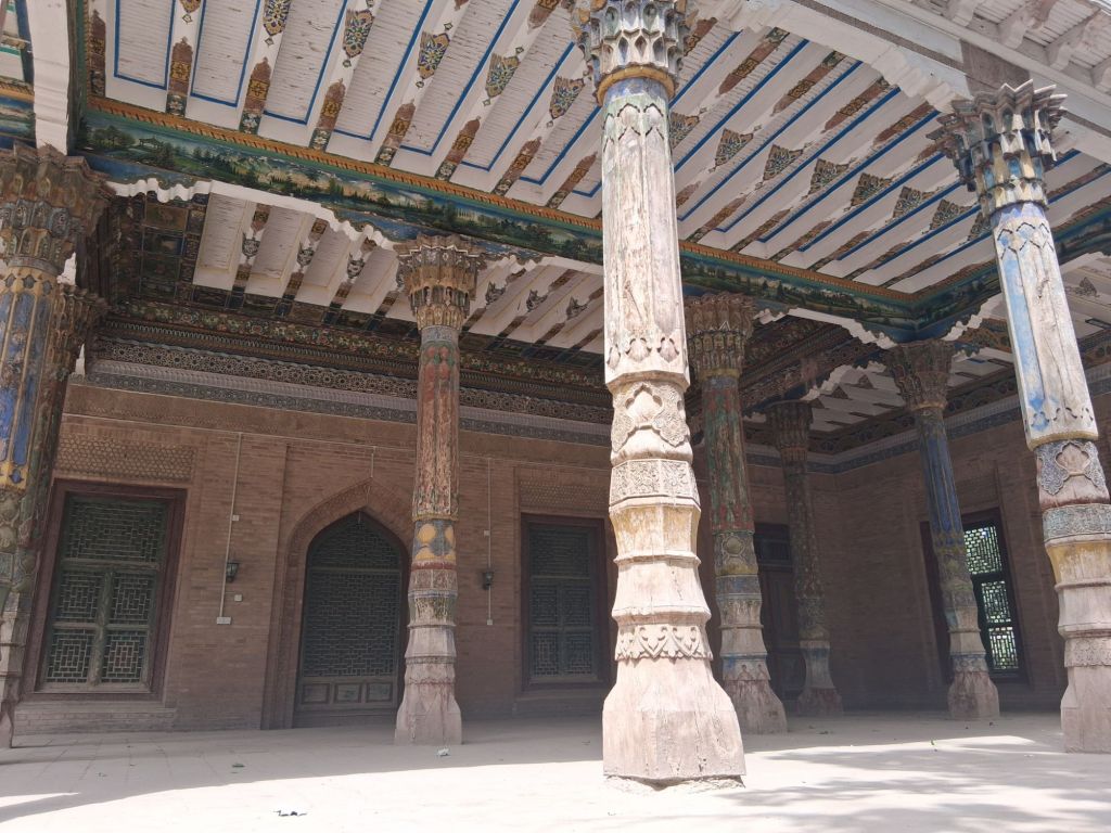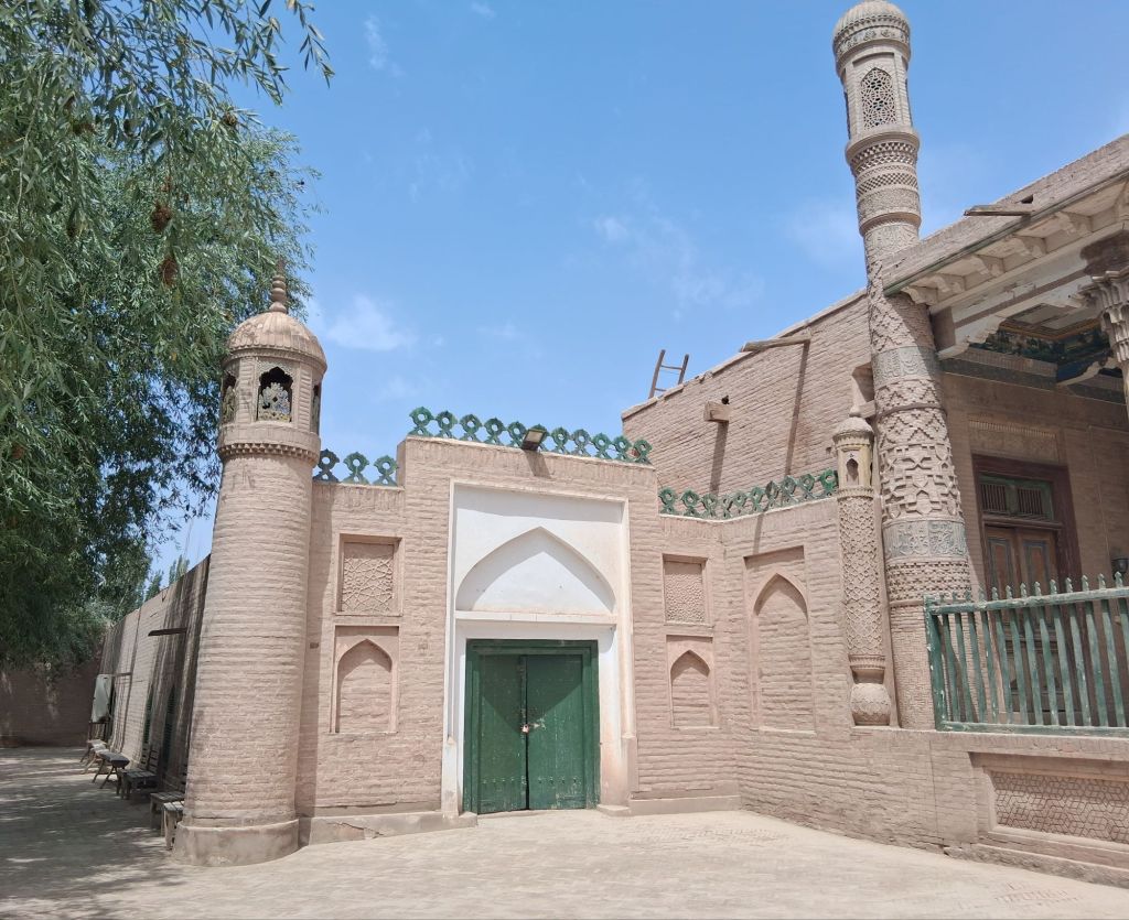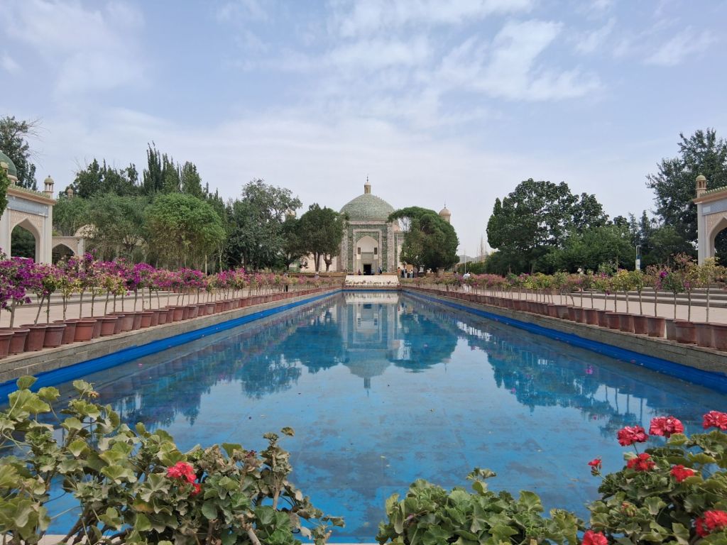 We started with the Abakh Hoja Masuoleum which was built by and for the Khoja family who ruled over this region in the 17th and 18th centuries and dates back to 1640 AD and contains 72 family members. This is considered one of the holiest pilgrimmage sites in Xinjiang for Muslims – therefore obviously what has been done is an odd welcome centre has been built infront, a garden planted and the focus shifted from Abkah Hoja to “The Most Fragrant Concubine” (as opposed to those less than favourite concubines one assumes?) who was a favourite of Emperor Qianlong during the Qing dynasy and is also buried here. However, it is a beautiful building and only had minor updates in the 1950s. In particular, it’s lovely to see some Central Asian architecture which really reminds me of Stage 1 of travels with Kathryn.