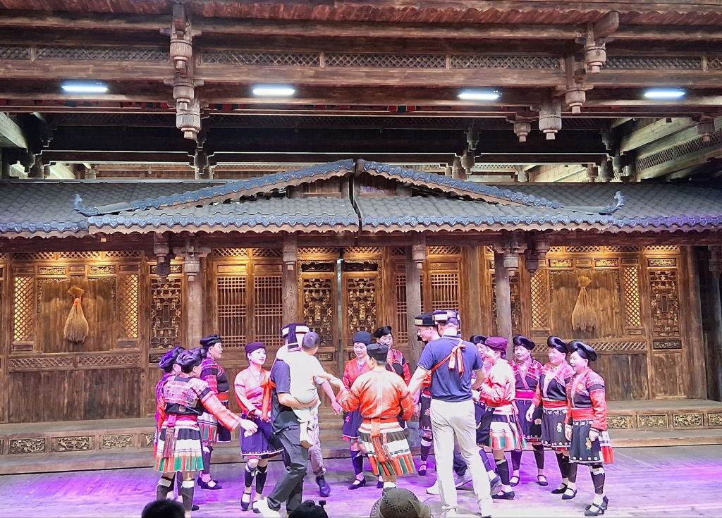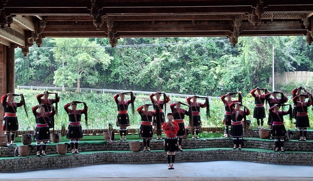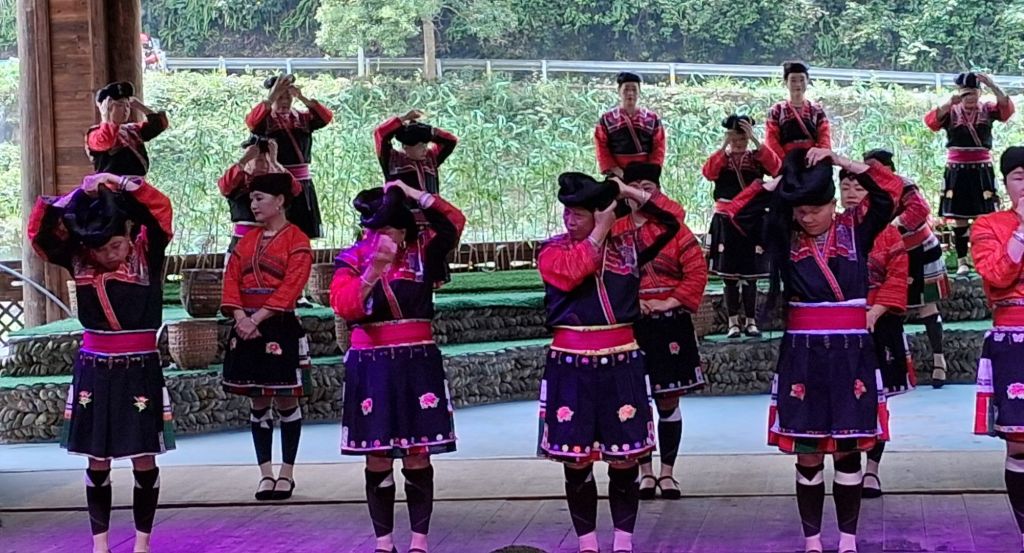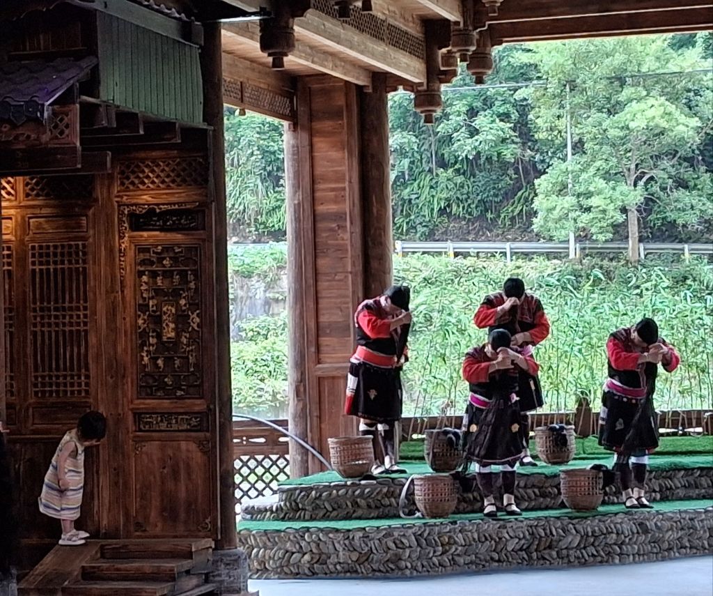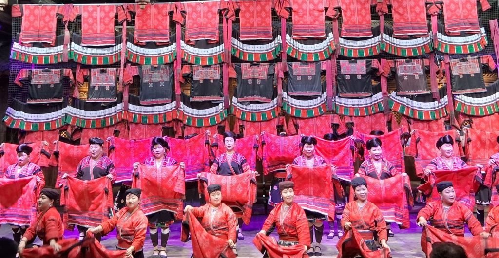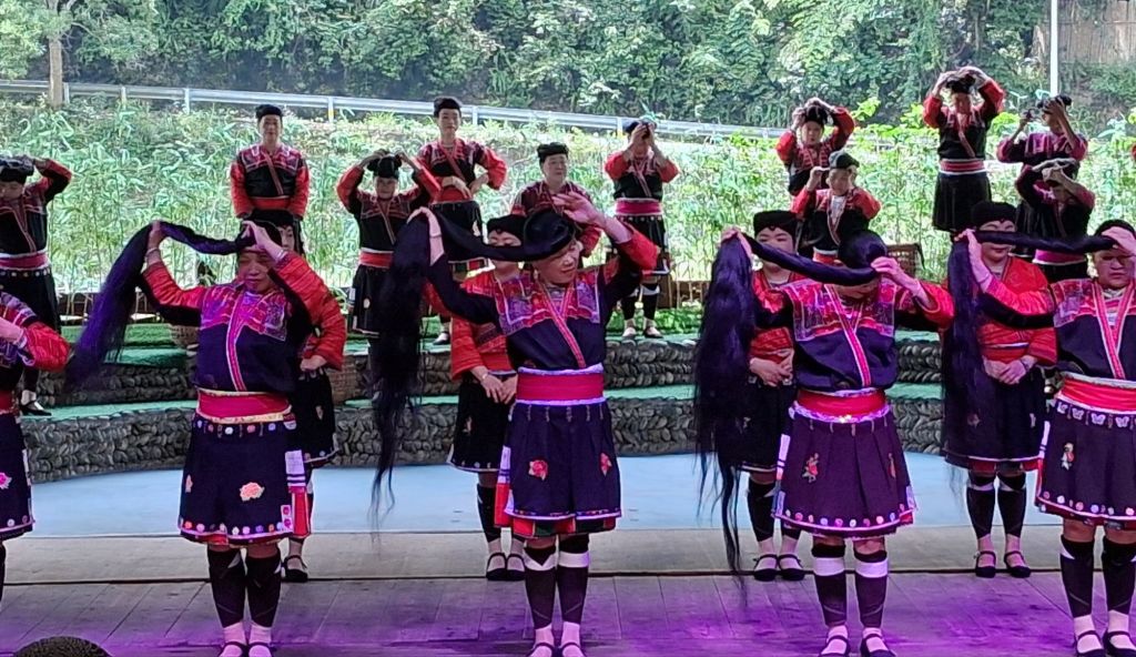 The terraces were cultivated by the local Yao and Zhuang people who still live here and retain much of their local customs and traditions (unlike in other areas we could mention) and therefore our first stop was Huangluo Yao Village which I was reliably informed translates as “long hair village”. There is a reason for this. Whilst the ladies have colourful dress, they also have incredibly long hair, which is wound tightly around their heads. I was talked into seeing “the show,” and I was glad I did as it was actually a good opportunity to see the traditional costumes alongside song and dance numbers. It was also rather delightful to see an old village that looked like a village – no rebuilding, no replicas, and no tower blocks. You can really tell that tourism here dates back to the 1950s… Anyway, the show: firstly, we had a short re-enactment of the “Clothes Drying Festival”. This happens on the sixth day of the sixth lunar month (most recently 6th June) and on this day the women wash and lay out their traditional costumes in the sun – no commentary given on whether they do men’s traditional costumes as well or whether these stay dirty…