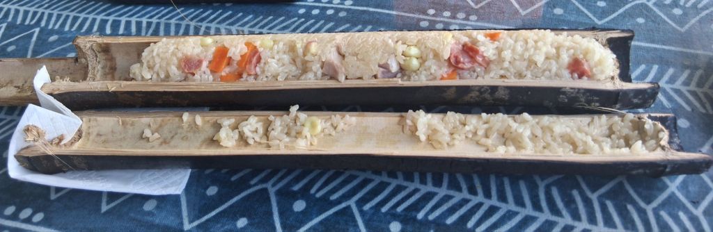 On route we were gifted a cucumber by a lady (apparently she is the mother of a friend of Kevin’s or maybe I just looked like I would appreciate it – and I did), and just before the top we did stop for an excellent meal of bamboo rice and a side of braised aubergines. Bamboo rice is, surprisingly, a mix of rice, vegetables, and what may have been related to chorizo stuffed inside a piece of bamboo and then roasted. It was delicious. As were the aubergines.