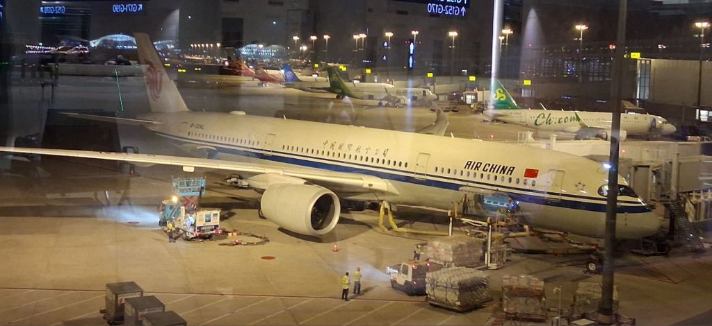 Anyway. I am now at the airport. I was greeted on arrival by 3 sets of closed doors, through the 4th and a barrier with a grumpy lady on it. No eye contact. She eventually opens the barrier and allows me in to scan my luggage. Then check in – in Disney stylee I joined the queue at 23.08pm and out at 23.29 with an aisle seat and waving off the giant yellow rucksack (hopefully to be seen again). Through immigration, then security, quick nip into duty free but as its just gone midnight it’s a limited selection unless you want to buy cigarettes, which I do not, then on train to another part of the airport. I travelled with Air China crew, which boded well, I thought. It’s now 12.15, and I’m sitting at my gate. Putting it out there now, the airport could do with more air conditioning, and I really didn’t need a heated toilet seat… I shall finish this and then hopefully settle in for a good 12.5hr sleep on the plane. A girl can dream (literally, hopefully)…