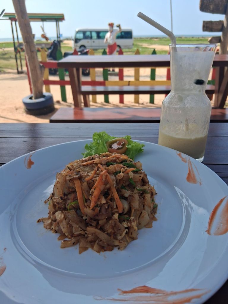 Anyway, priority on waking was food. The hotel we are staying at is on the road behind the beach, so I decided to walk to the beach (finding a gap in the buildings on the other side of the road) in search of sustenance and luckily there were a couple of places more than happy to oblige. Pictured below is kottu which is chopped up roti, shredded vegetables, eggs and (in this case) seafood (calamari, prawns although also tuna – less good imho) all fried up together. It is delicious, and I felt a quick and sustaining lunch.