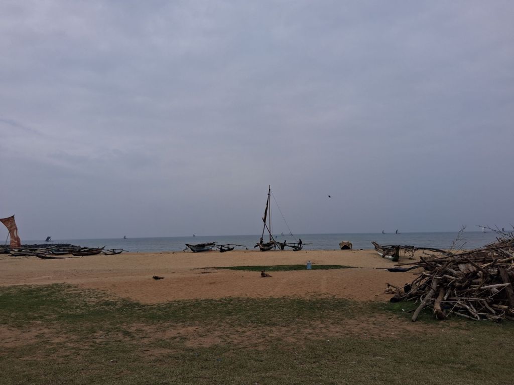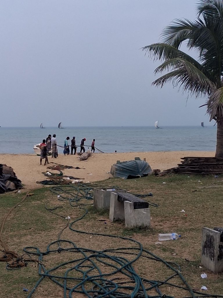 We are now leaving Negombo and driving north-east to Anuradhapura. This will take around 4 hours, but we started with another fish related photo opportunity. These are the traditional fishing boats which go out at night as the winds blow away from the shore, and come in in the mornings when the winds change direction. The people pulling the rope are pulling a huge net which had been dropped by the boats and waiting to see what they catch.