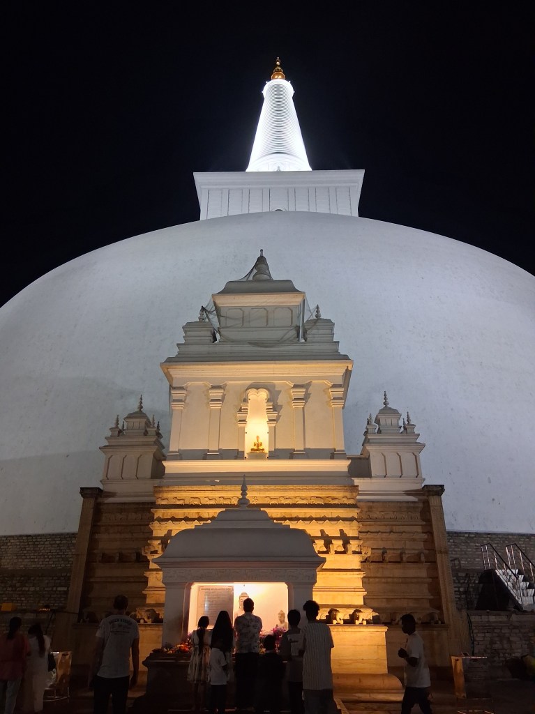 By now it was after 6.30pm and properly dark, therefore the intrepid cyclists had to ride back to return their bikes (we he support vehicle provided additional lighting) and our final stop was the most sacred Ruvanvelisaya Dagoba. This dates back to 3rd century AD and was constructed to enshrine portion of Buddha’s ashes. This was by far the busiest site we visited and was thronging with pilgrims and you could really smell the incense, flowers, and coconut oil (the traditional offerings made by devotees).