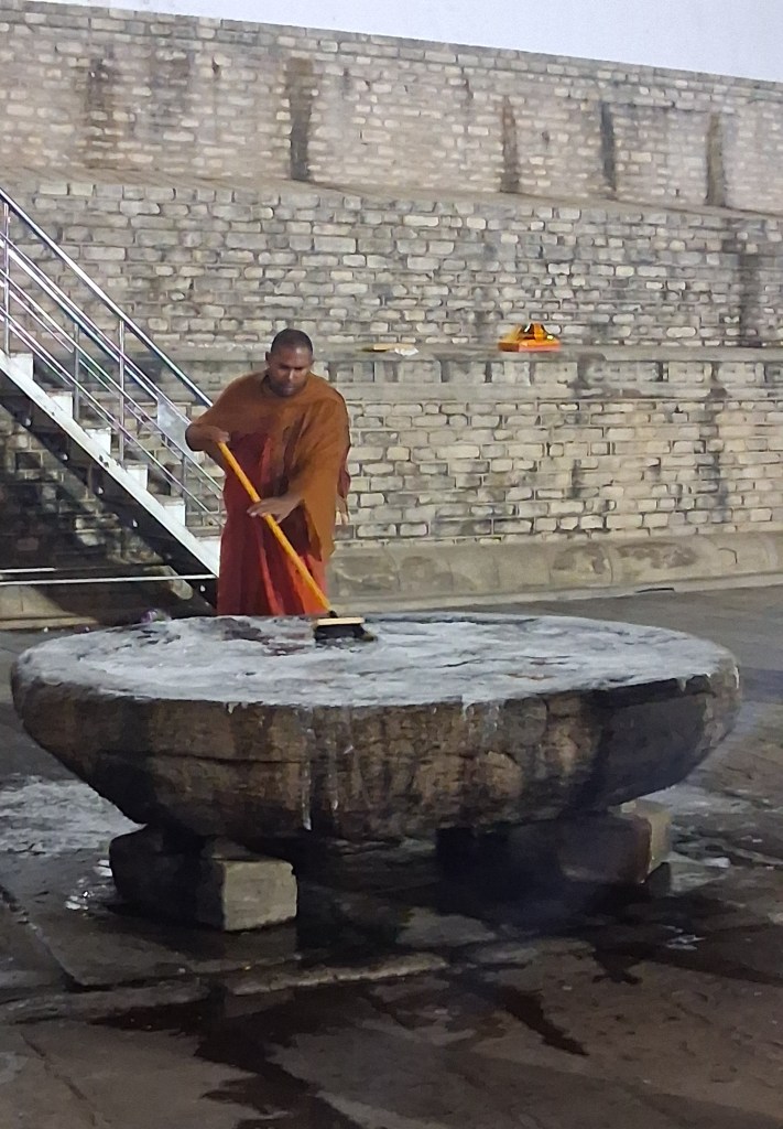 Our final daylight stops were to see the finest carved moonstone and Guardstone across the complexes. The Moonstone is a half moon stone which is always placed at the bottom of the stairs into a buddhist building, and either side of the stairs will be two Guardstones depicting Buddha. The Moonstone dates from 7/9th century AD. If you start at the outer layer of the moonstone you can see flowers which represents human lust, then a ring of animals from elephant (life) to bull (death) representing life and these repeat showing reincarnation, there is then deep flowers representing life’s complexities, then swans who can seperate milk from water (apparently) demonstrating that a wise man can seperate the good from the bad, then lighter flowers representing problems becoming lighter and the final layer are waterlillies depicting nirvana.