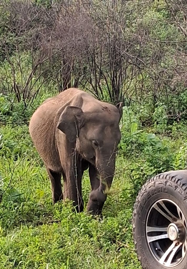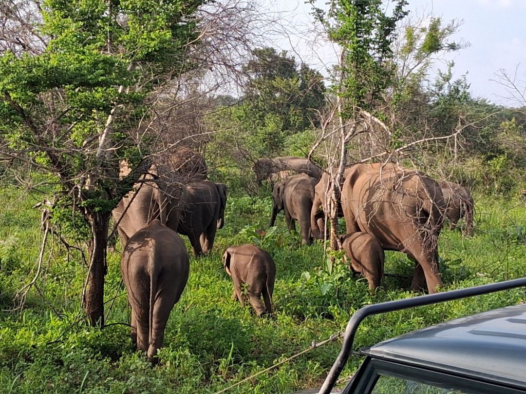 Sri Lankan elephants are the largest of the Asian elephants. Very few males actually have tusks, only around 5% and we did see one in the group which had tusks. These elephants can roam 70km a day and have to eat 150kg of vegetation a day – given we saw them munching on grass you can see why they need so much to keep them going… The herds are only female and males up to the age of 13, after 13 males become loners and leave their family.